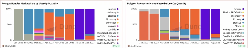 ▪ Pimlico 的 bundler 市占率(全链 bundle 的 userop 占比 52% )和盈利(polygon 上盈利第一, 7 月达 637 MATIC,optimism 上也是正盈利)都领先;