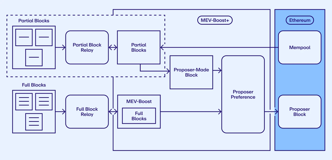 在 PBS 中提议者对交易没有排序和选择权力,是保护构建者的 MEV 不被窃取的必要条件,那么如何在保护构建者的同时让提议者可以包含交易?MEV-Boost+ 引入部分区块中继( partial block relay)产生部分区块拍卖机制,提议者可以自己创建区块的一部分(区块其余部分 RoB),并将另一部分拍卖出去(区块顶部 ToB),由构建者创建。此外,部分区块拍卖被提议作为 PBS 中 crLists(抗审查列表)的替代方案。MEV-Boost+ 是 MEV-Boost 的补充软件,MEV-Boost 仍将处理整个区块的拍卖,MEV-Boost+ 将处理其余的部分区块拍卖。