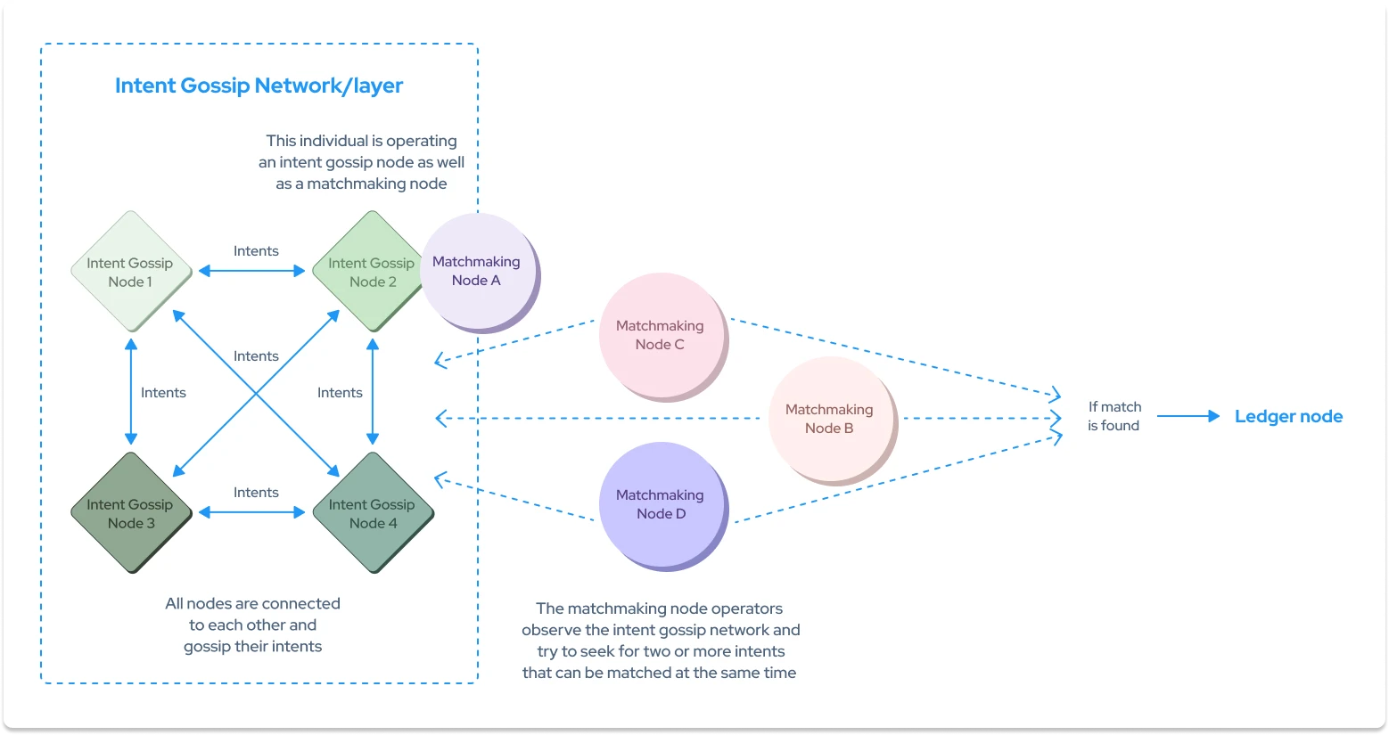 在以太坊 EVM 中,交易并不强制要求未来状态而是授权具体执行路径,而 Anoma 包含一个匹配系统,允许用户使用 Gossip 广播交易意图。简单来讲 Anoma 由两个主要部分组成:分布式账本和意图匹配系统,它们相互补充也可以单独运行,通过使用 Intent Gossip 运行节点、Token 交换求解器和请求新意图的 RPC 服务器,并将交易从匹配的意图提交到分布式账本中,从而帮助用户自动发现交易对手;