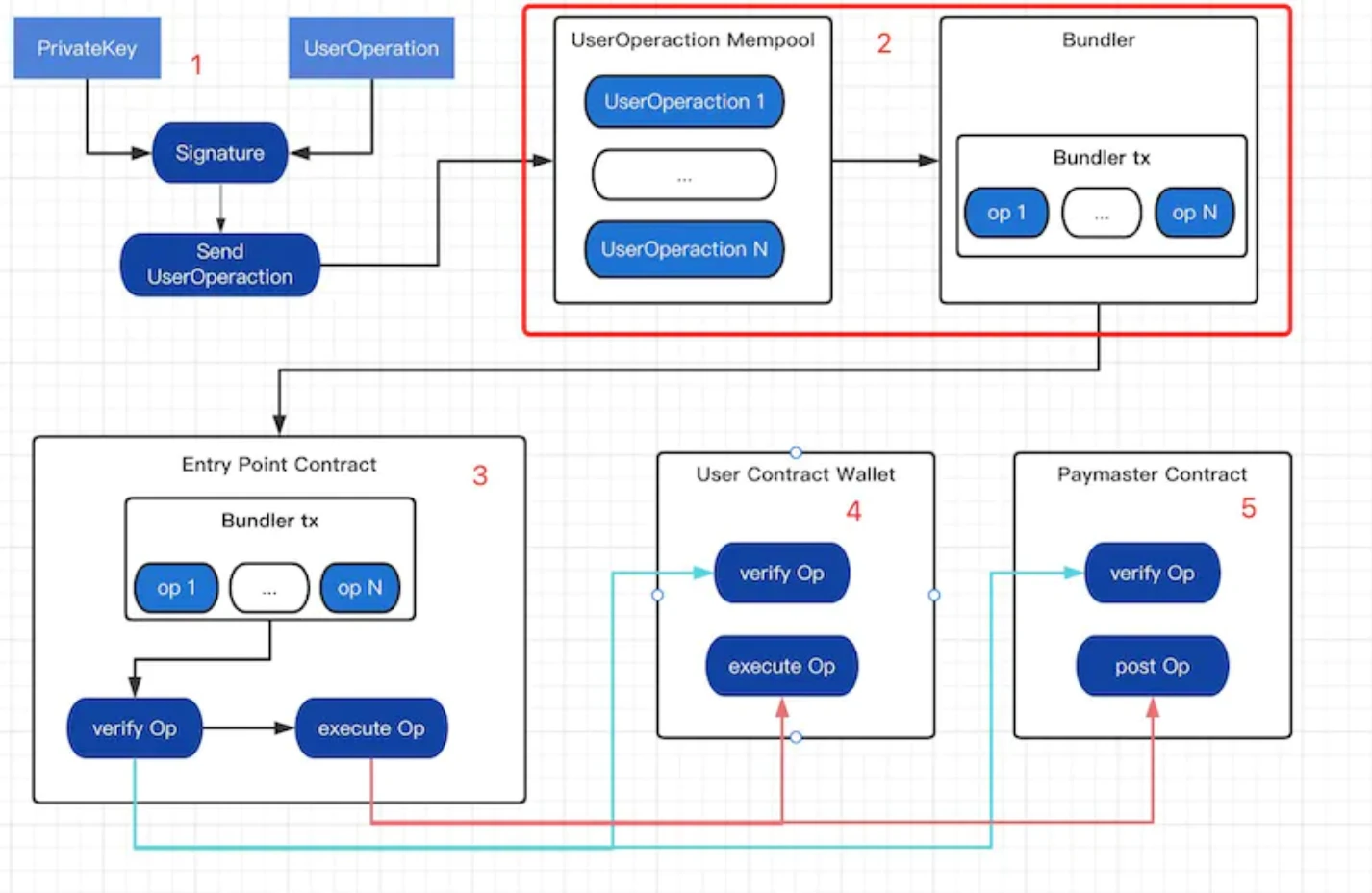 将操作发送到P2P “用户操作内存池(UserOperation Mempool)” 并由捆绑器对执行的签名,Gas 费用等用户操作交易内容进行“捆绑打包”提交上链(实际包含多种情况这里不做展开);