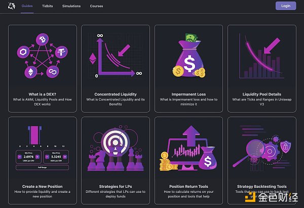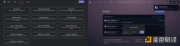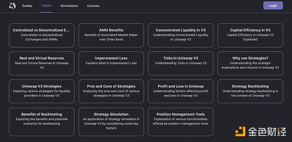 模拟(Simulations):这部分就到了要深入实践学习的阶段。在这个版块里,你可以练习添加、删除流动性等场景,还可以探索高级头寸管理工具,这里相当于一个视频教程,每一步操作都有演示,相比于看文字教程,视频形式对加密小白更友好。