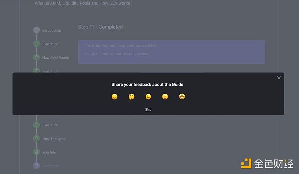 Uniswap University 也不提供任何激励手段,当你选择想学习的章节并完成后之后有一个很简洁的反馈模式。是的,就像普通大学里那些用来当作课后练习的学习网站一样,每一小节后面还会提供几道练习题,确实非常适合小白入门学习。