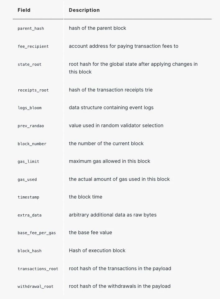 块结构: 块包含大量信息。然而,在探索L2时,我们只关心 execution_payload_header(即块哈希)。在下图中,有 execution_payload_header 中包含的所有数据的结构(块哈希)。