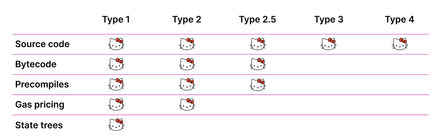 其核心思想是:Type 1 (例如 Taiko )与以太坊完全等效,而 Type 4 (例如 zkSync)在高效的证明生成方面表现出色。所有其他类型,Type 2、Type 2.5 和 Type 3 ,介于这两者之间(例如 Polygon zkEVM、 Scroll 、 Linea )。