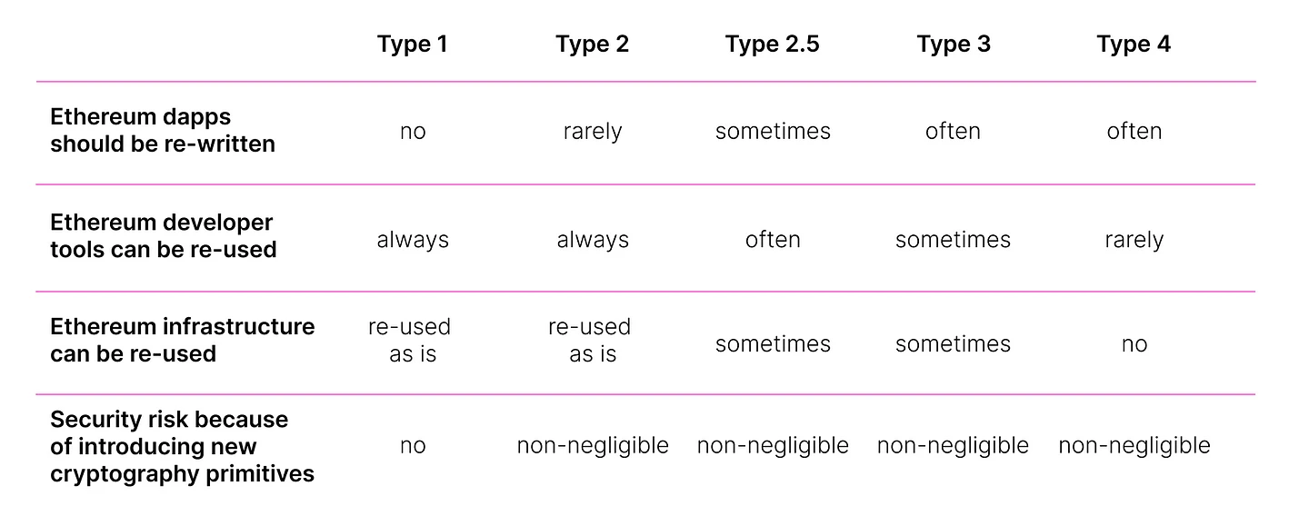 Type 1 表示不更改以太坊系统的任何部分,以便更轻松地生成证明。对以太坊的不改变意味着安全性上的不妥协,因为大多数密码学原语(例如哈希函数)、开发者基础设施(例如调试器)或链基础设施(例如执行客户端)已经经过了 9 年的实战测试。