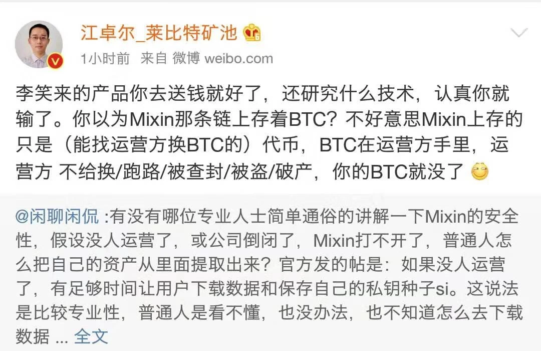 而今日 Mixin 出现安全事故之后,江卓尔一则发布于 2019 年的微博也被人们翻了出来。江卓尔曾写道,“运营方被盗,你的 BTC 就没了。”不料一语成谶。