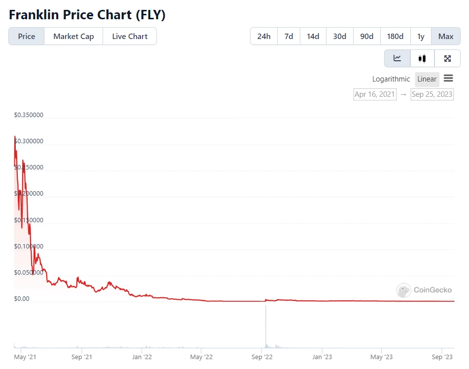 可以在这里找到。根据 CoinGecko 数据显示,FLY 的价格从一开始就在下跌,现在市值为 35 万美元。