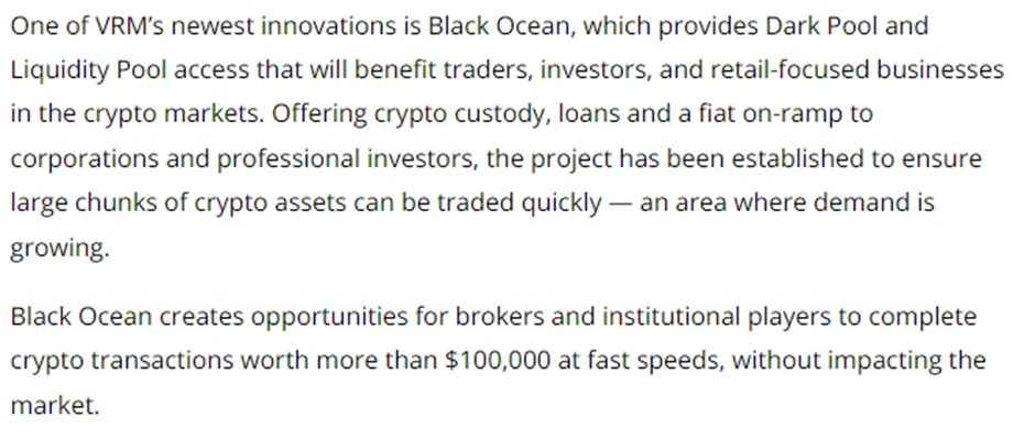 Zac Zou 现在也在 DWF Labs 工作。此外,Zac Zou 是 HTR Trade 的创始人。 VRM 与 LD Capital 共同投资了 HTR Trade。VRM 团队还创建了自己的 OTC 平台,名为 Black Ocean 。