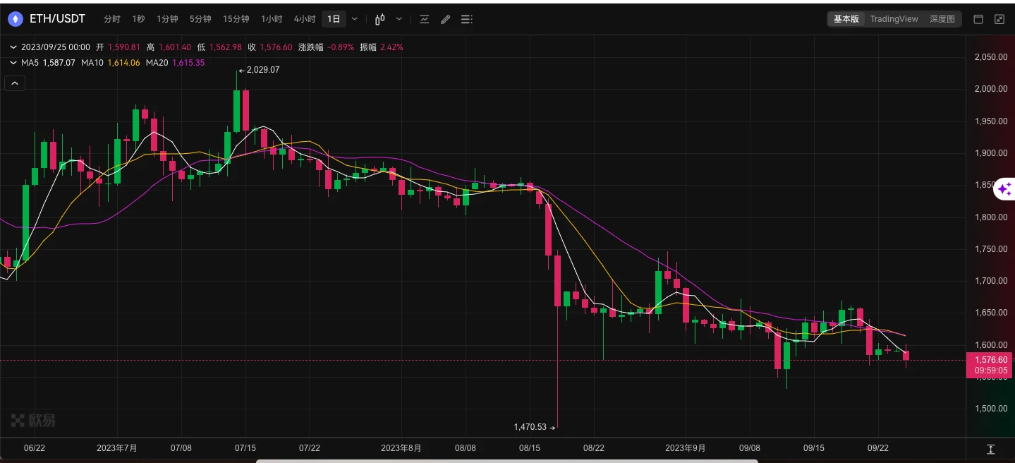 OKX 行情 数据显示,上周 ETH 一度上涨至 1670 USDT,周内收于 1590 USDT,环比下降 2.4% 。