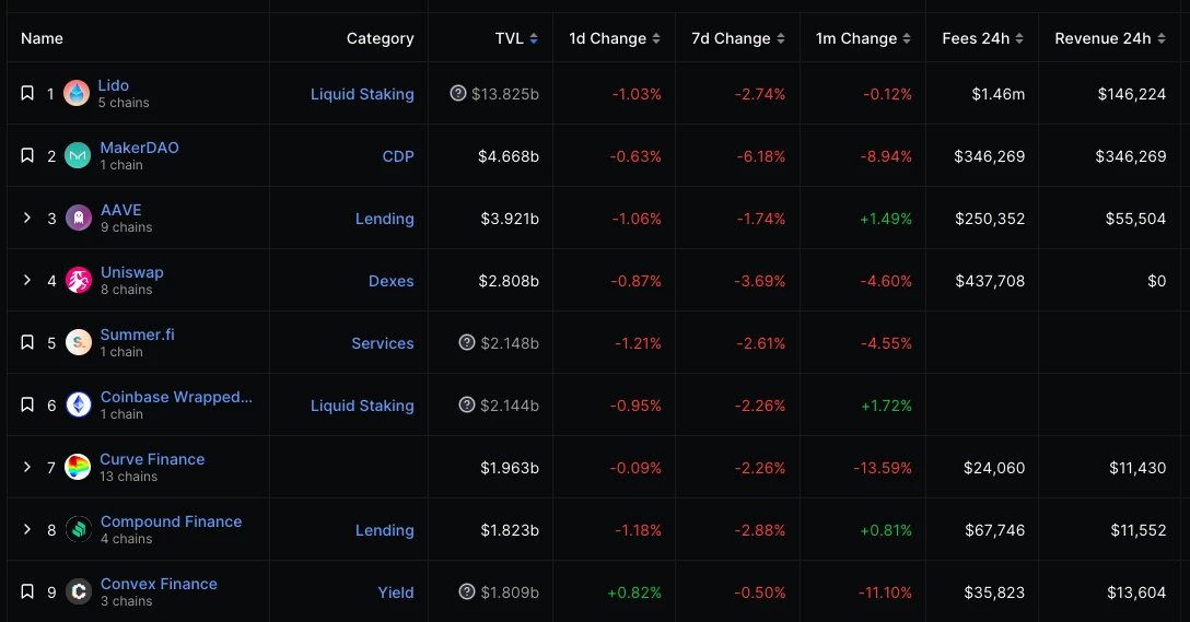 DeFiLlama 数据显示,上周链上锁仓抵押品价值从 213.3 亿美元下降至 206.3 亿美元,环比下降 3.2% ;从单个项目来看,锁仓价值前三名分别是: Lido 138.2 亿美元; MakerDAO 46.6 亿美元; Aave 39.2 亿美元;
