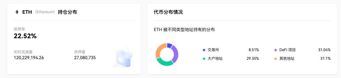 OKLink 数据 显示,目前 ETH 2.0 总存款量达到 2708 万个 ETH,质押率 22.52% ;从 ETH 持仓地址分布来看,交易所占比 8.51% ,环比下降 0.07% ;DeFi 项目占比 31.04% ,环比上涨 0.26% ;大户地址(排名前 1000 的地址且排除交易所、DeFi 项目)占比 29.35% ,环比下降 0.03% ;其他地址占比 31.1% ,环比下降 0.16% 。