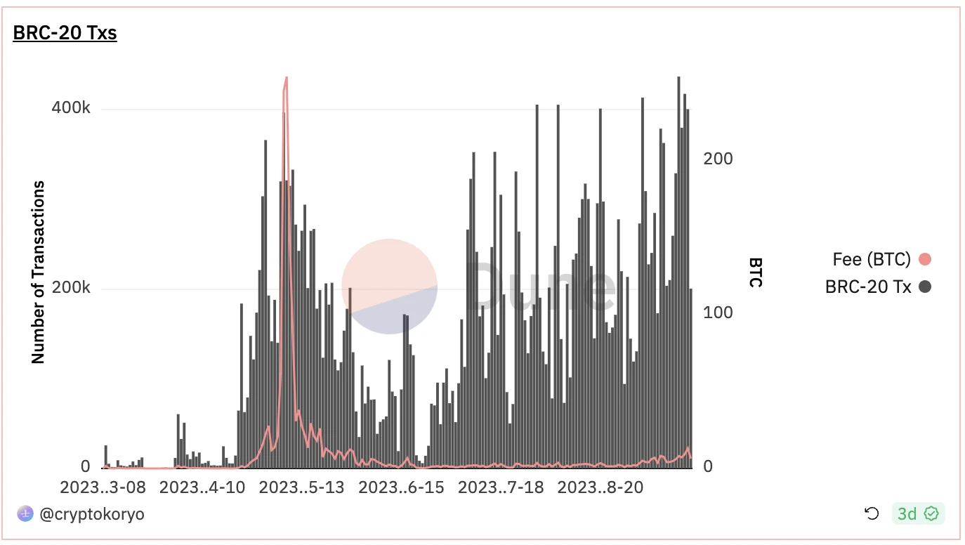 根据 Dune 数据显示,截至 9 月 23 日,Brc 20 协议所产生的交易数为 2860 万次,产生的手续费达 1590 枚比特币,计 4240 万美元。以 ORDI 作为指数去观察,其巅峰时日交易额超 1 亿美元,目前日交易额最低降到 800 万美元。