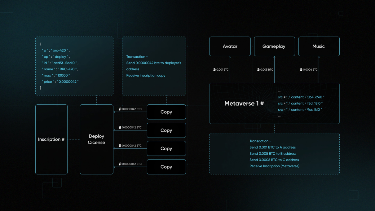 Brc 420 的推出者是 Recursiverse,Recursiverse 诞生于递归铭文时期。Brc 420 通过递归的方式定义了更复杂的资产格式,并完全开源,任何人都可以创建自己的元宇宙铭文。同时,Brc 420 在单个铭文的基础上建立了使用权和版税之间的约束关系。当用户拥有一个铭文时可以分配其使用权并为其设定价格,此举可激励 Ordinals 生态更多创新。
