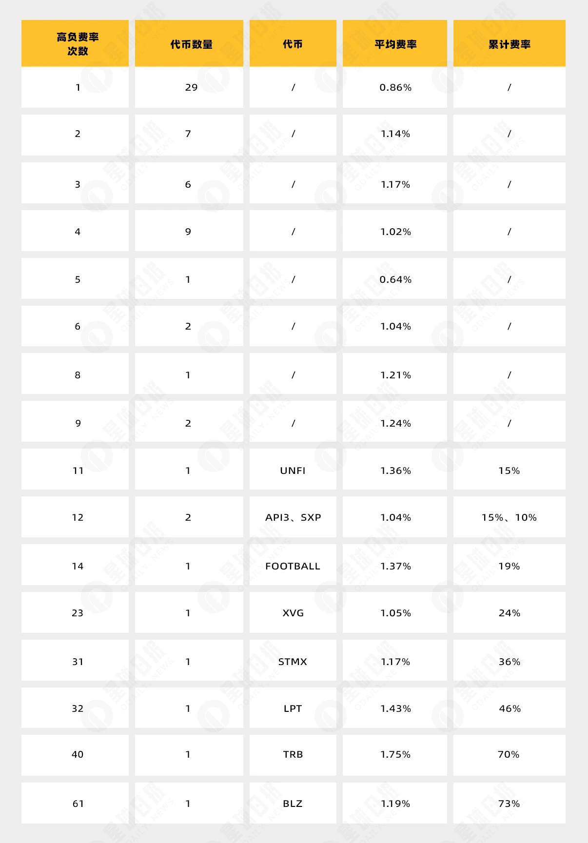 平均费率: 并未随着高负费率频数的增加而有明显上升,而 LPT、TRB 等代币在广泛传播时均为满负费率(-2.5% 或-3% ),说明在其达到满负费率之前或之后,在中等的负费率水平上维持过较长一段时间。