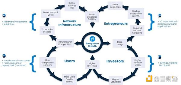 随着网络的增长,投资者变得越来越感兴趣,并开始资助该项目。如果项目是开源的,或者向公众提供贡献者 / 用户数据,开发者可以在这些数据的基础上构建 dApps,从而在生态系统内创建额外的价值,吸引更多的用户和贡献者。下图演示了这个正向反馈在市场中的工作示例。