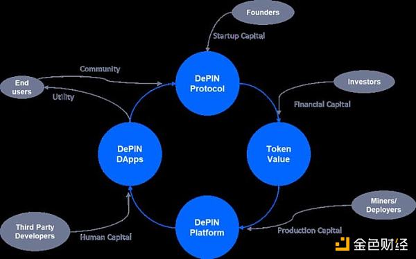 换句话说,DePIN 利用区块链和代币来创建和激励部署和使用产生价值的物理基础设施。DePIN 依赖于去中心化的网络和社区,而不是中心化的的后端和公司,用于交易和业务逻辑。