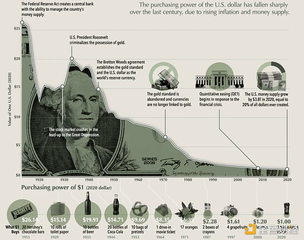 与私营部门不同,管理不善和挪用并不会导致国家破产。当政治家可以用无穷无尽的货币收买选民时,即使是民主国家也不能辛免。在我一生中,美元已经贬值了近四次,过去三年里,政府印制了流通中美元的 80%。这种趋势令人震惊且不可持续,以至于像 Balaji 这样的名人曾押注美元在今年 6 月崩溃,赌注为 100 万美元。