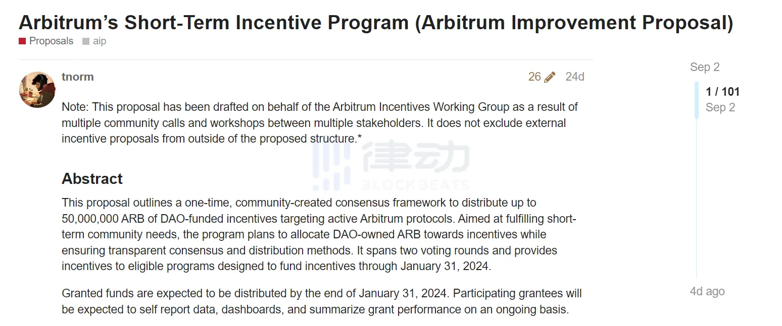 BlockBeats 在 9 月 4 日报道,Arbitrum 激励工作组在 Arbitrum 社区论坛中提交「Arbitrum 短期激励计划」AIP 提案,该提案旨在从 DAO 财库中向活跃的 Arbitrum 协议分配最高 7500 万枚 ARB 的奖励,以满足社区的短期需求。