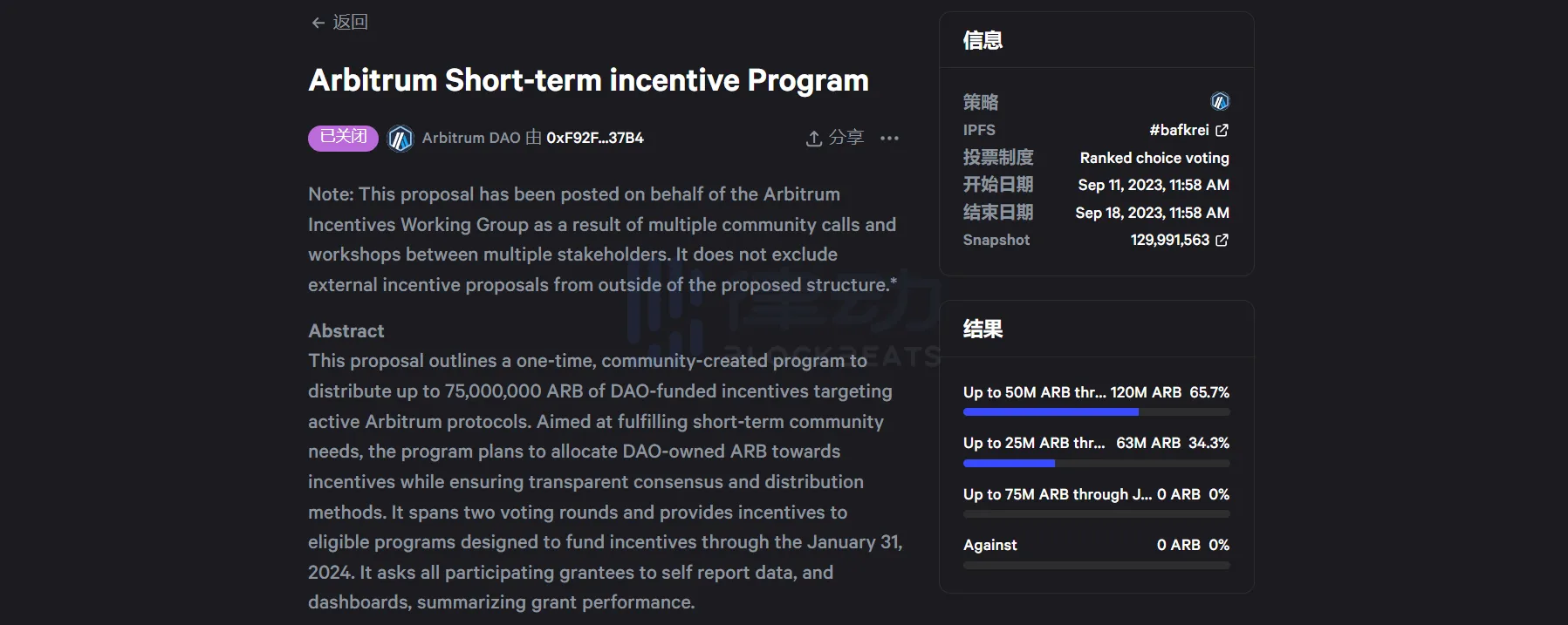 9 月 11 日,Arbitrum 社区发起「向 Arbitrum 生态活跃的协议分发 7500 万枚 ARB 资助激励」提案,该计划旨在满足短期社区需求,计划将 DAO 拥有的 ARB 分配给激励项目,同时确保透明的共识和分发方法。 18 日 ,该提案以 0 反对票计录获得通过。
