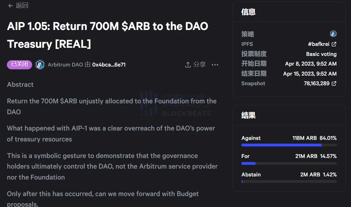 4 月 15 日,据 snapshot 数据显示,Arbitrum「将 7 亿枚 ARB 返还给 DAO 财库」的治理提案未能获得投票通过,反对票共计投出 1.18 亿枚 ARB,占总投票数量的 84.01% 。