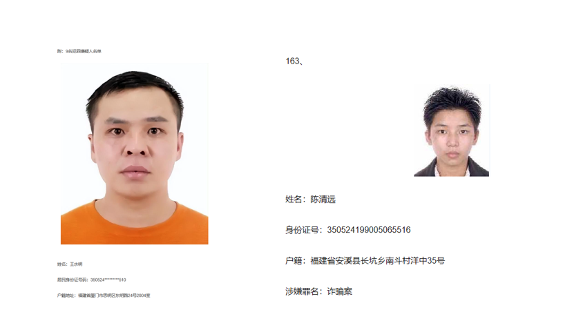 实际上,10人中已有5人被中国公安通缉。早在2015年,苏文强、王德海、苏剑锋就因一起网络赌博案被湖北桂阳县公安经办通缉。陈清远被福建安溪警方通缉的115名涉嫌诈骗的犯罪嫌疑人之列。王水明则是8月15日山东淄博警方捣毁的操作赌博网站、应用程序和网络赌博平台等活动的犯罪团伙之一。