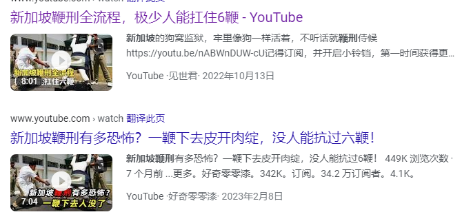 新加坡鞭刑在Youtube的搜索,来源Youtube