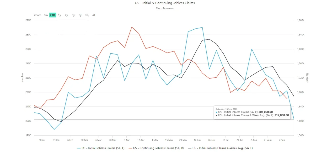 惊喜的是, 9 月 16 日那周的美国失业申请数实际上是下降的,而不是大家预期的微幅增长。它们从 221 k 下降到了 201 k。过去四周的平均数也有所下降。更令人振奋的是,继续申请失业救济的人数在 9 月 9 日那周从 1683 k 下降到了 1662 k。当查看每个州的数据时,会发现只有 14 个州的季节性调整后的初次申请数有所增加。这种初次申请数的下降,是我们自年初以来看到的最低水平,这真正突显出当前就业市场的强劲和紧张。这表明我们可能会看到稳健的就业增长,这可能会进一步推低失业率。