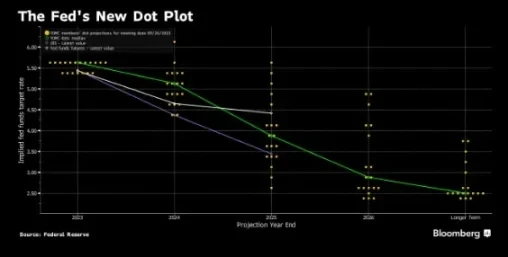 联邦公开市场委员会(FOMC)将其 2024 年核心 PCE 预测维持在 2.6% ,将 2023 年修正为 3.78% ,并将其实际 GDP 预期从 1.1% 提升至 1.5% 。这种「软着陆」的组合基本符合投资者的预期,并被视为对股票的中期利好。FOMC 为 2023 年余下的时间保留了一次加息的可能,并将 2024 年的中位点提升至 5.1% ,同时长期点保持在 2.5% 。点阵的上移对于积极的增长修订形成了轻微的平衡。
