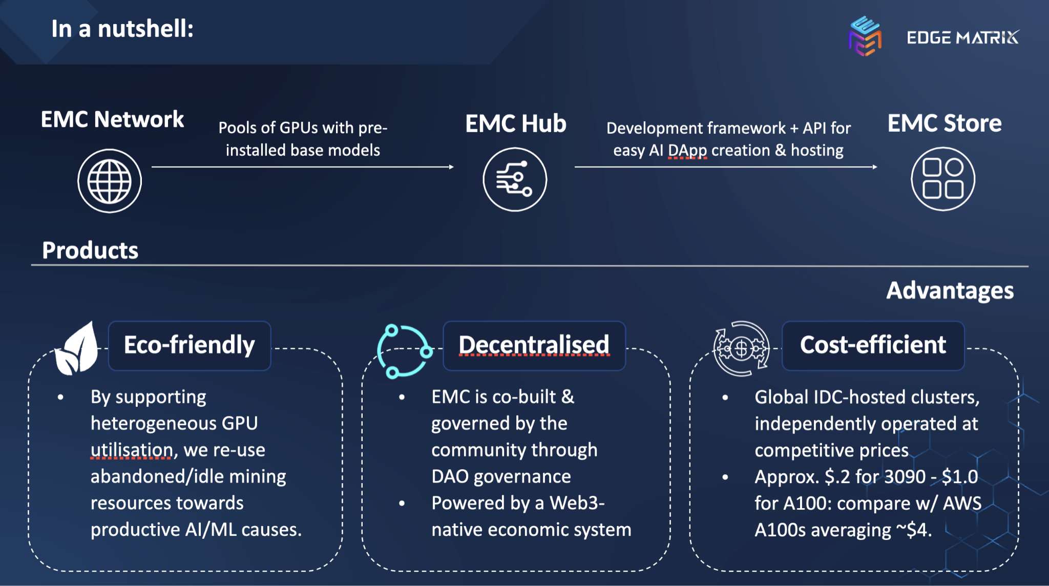 Zed介绍称,EMC 创始团队中包括前微软云亚太总裁和前亚马逊AWS的高管,对云业务的熟悉使EMC选择了去中心化算力这个方向,由此能够大幅降低基础设施成本,同时保持较高的利润率。