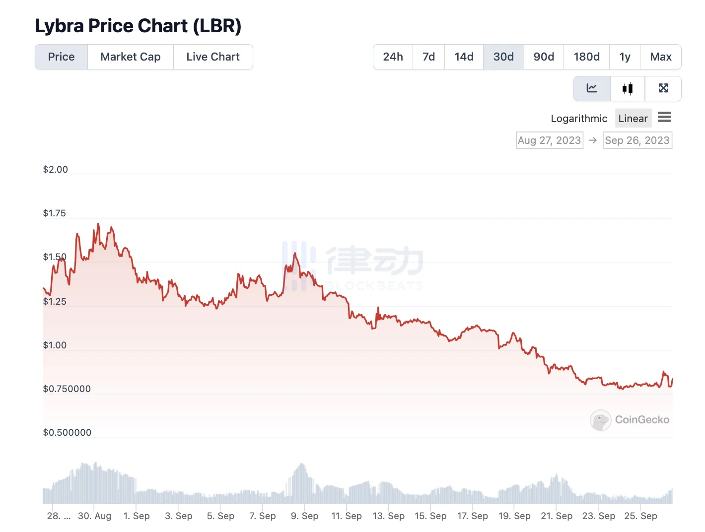 但尽管社区对 Lybra 协议有着较高的关注,LBR 代币价格在过去一个月时间却持续下跌。截止目前,据 CoinGecko 数据显示,LBR 代币价格为 0.833 美元,较 8 月高点 1.72 美元已跌去超 50% 。