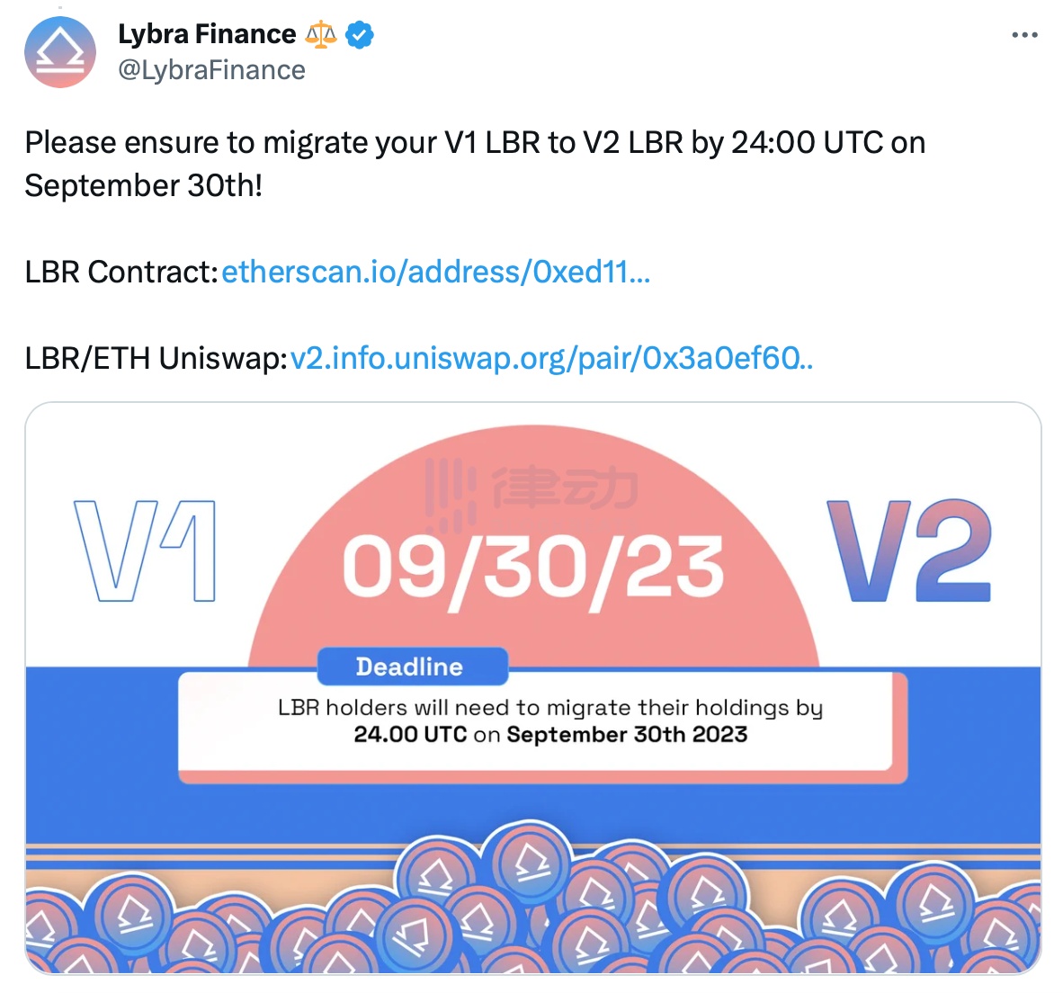 9 月 1 日,LSD 稳定币协议 Lybra Finance 宣布推出 Lybra V2,用户应确保在北京时间 10 月 1 日上午 8 点前将 LBR 从 Lybra V1 迁移到 Lybra V2。
