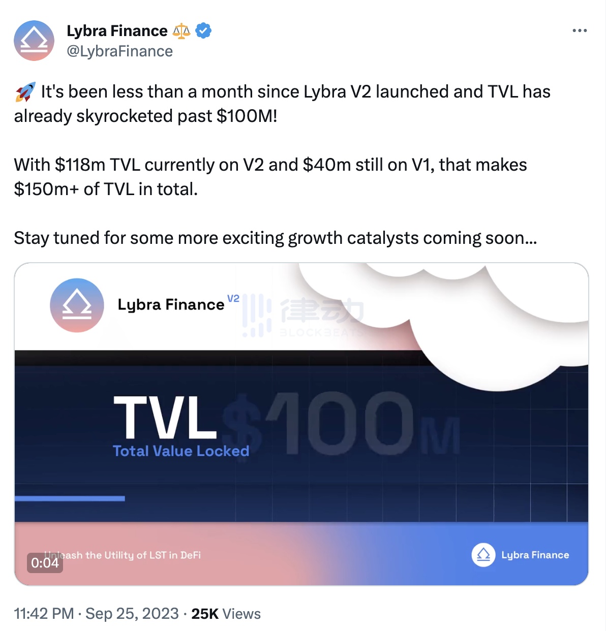 BlockBeats 消息, 9 月 26 日,LSD 稳定币协议 Lybra Finance 在社交平台上表示,Lybra V2 上线不到一个月,其 TVL 已突破 1 亿美元,目前 Lybra V2 TVL 达 1.18 亿美元,此外,Lybra V1 TVL 达 4, 000 万美元,Lybra Finance TVL 总计超过 1.5 亿美元。