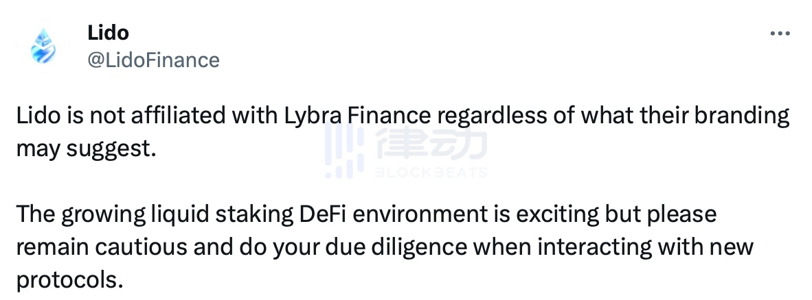 随后在 6 月 1 日,Lido 官方公告澄清称,Lido 与 Lybra Finance 无关,不论其品牌如何暗示,「虽然不断发展的 LSD DeFi 环境令人兴奋,但在与新协议互动时,请保持谨慎并做好尽职调查。」