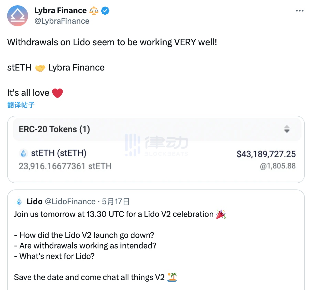 今年五月中旬,Lybra Finance 团队官方推特曾于 Lido V2 庆祝活动期间发表推特暗示自己与 Lido 团队的合作关系。