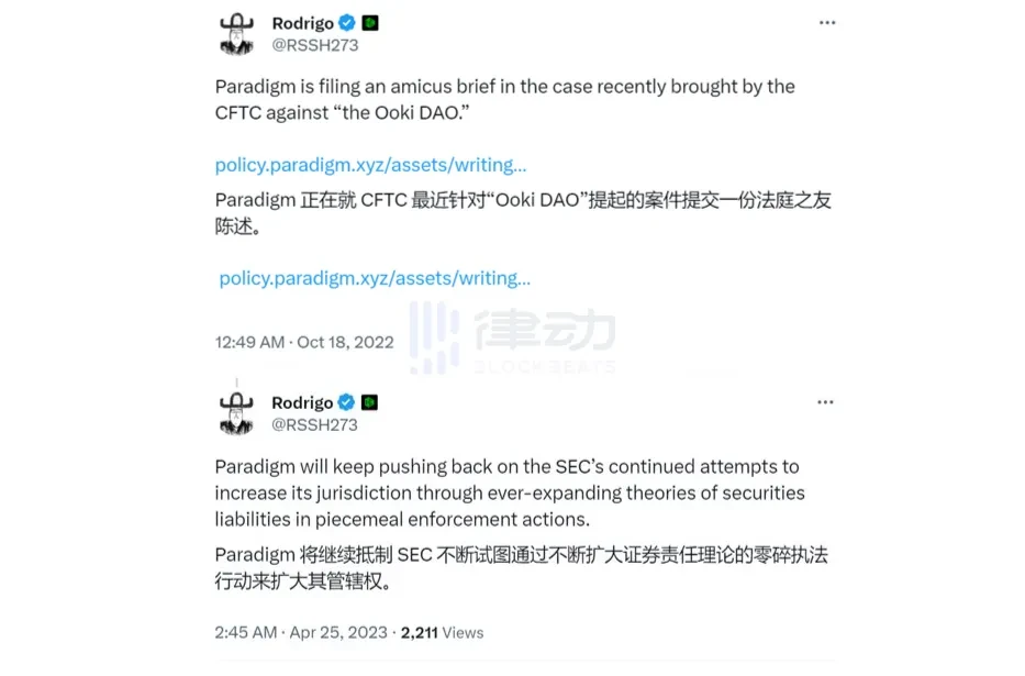 BlockBeats 曾报道, 2022 年 10 月,Paradigm 提交法庭顾问简报声援 Ooki DAO。今年 4 月 25 日,Paradigm 法律负责人 Rodrigo 又表示,为避免 SEC 将稳定币定义为证券,已在 Terra 案中提交法庭之友简报。