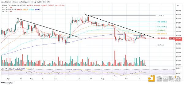 BTC 低于 23.6% Fib的 1 日图 | 资料来源:TradingView.com 上的 BTCUSD