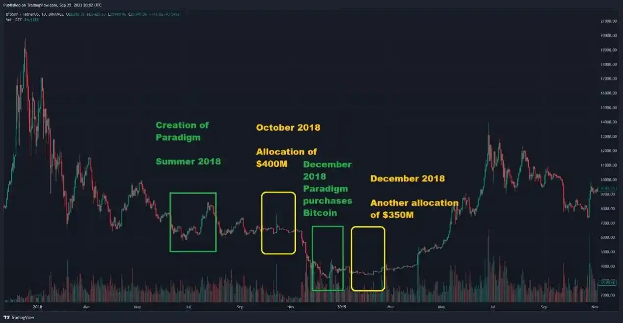 2018 年 10 月,Paradigm 从投资者那里获得了 4 亿美元融资(注:资金全部来自耶鲁大学捐赠基金)。到 2018 年 12 月,Paradigm 主要投资于比特币和以太坊,并在比特币价格低于 4000 美元的时候完美抄底(注:由上图可知,抄底比特币后,未来基本都是上涨状态)。这一消息传到投资人后,机构投资者(大学)追加认购了 3.5 亿美元。