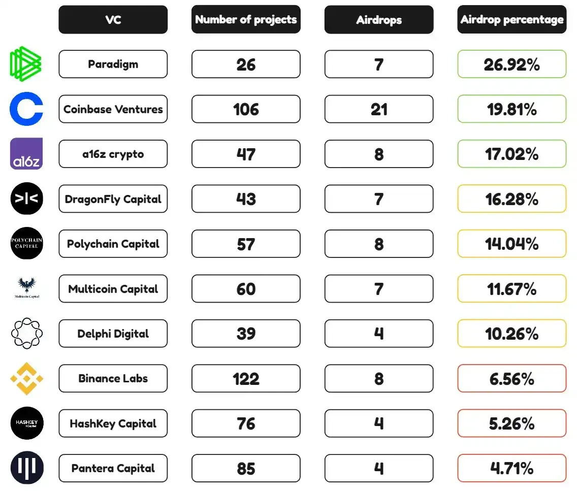 值得一提的是,在 Arbitrum 空投之前,Paradigm 被列为加密行业最重要的三个空投的投资者: Uniswap 、 Ribbon Finance 和 dYdX 。可能这也是 Paradigm 在空投盛行时代受加密社区追捧的原因。有加密 KOL 总结了热门基金投资了哪些项目以及其中有多少进行了空投,Paradigm 拔得头筹。