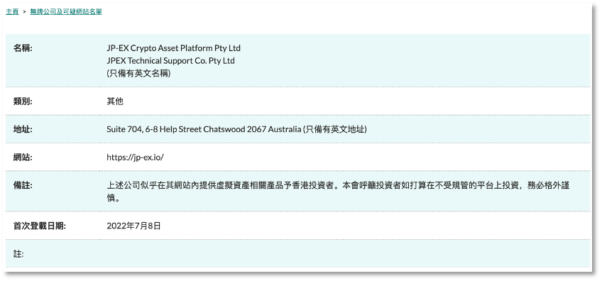 9月13日,SFC表示,靠名人、网红引流的JPEX存在作出“持牌”、“与香港上市公司订立业务合作”等虚假且具有误导性的陈述,且旗下实体未曾向SFC提交任何虚拟资产交易平台的牌照申请。而早在2022年7月,该平台就被列入SFC的“无牌公司及可疑网站名单”中。