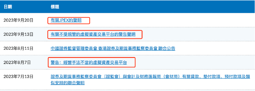 9月13日,JPEX出现在SFC的警告声明中,成为被SFC第一个点名为“不受规管”、“可疑的”虚拟资产交易平台。这家交易平台也几乎是SFC出台“4+1”名单措施的导火索。