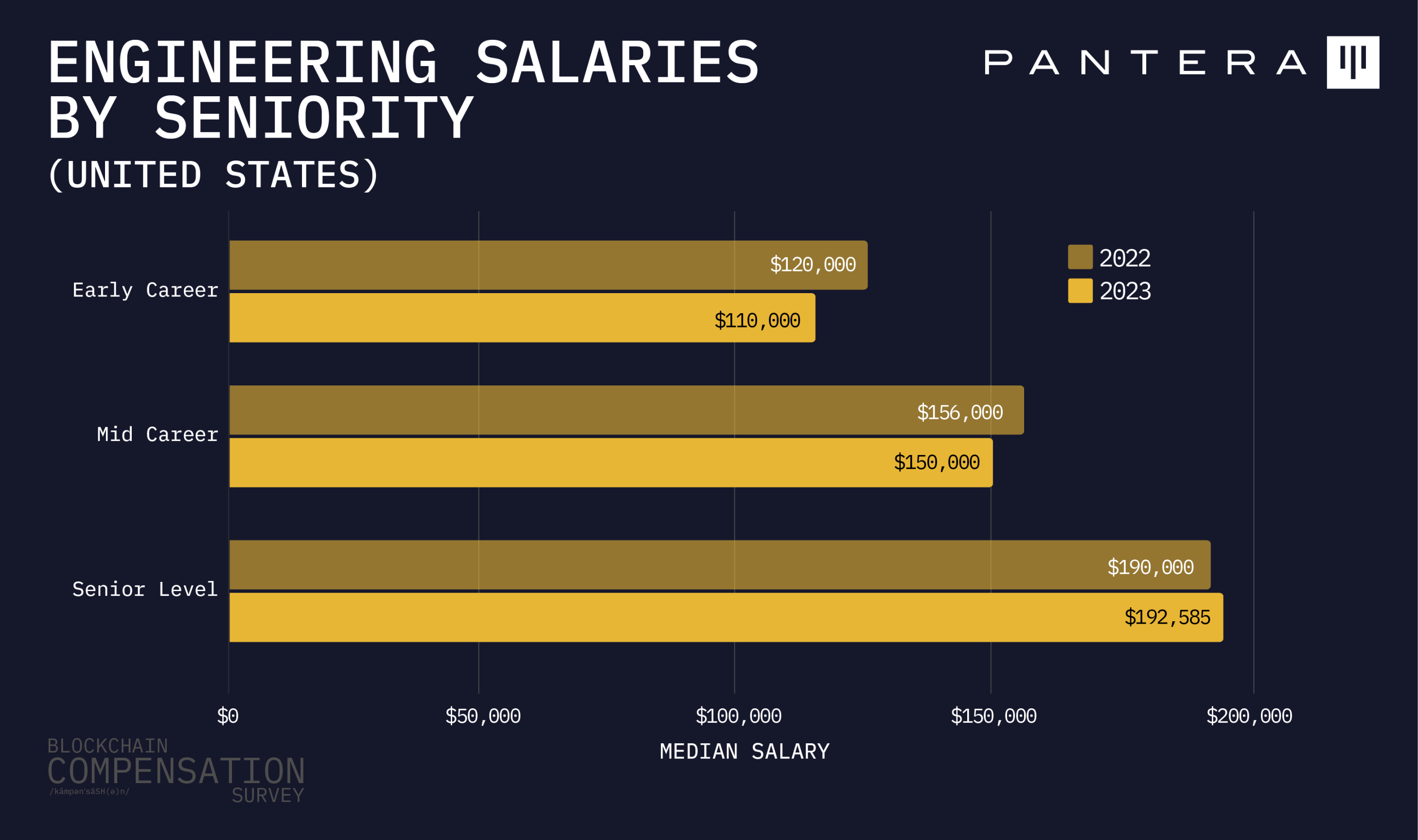2、工程师薪酬: 如果你是北美的软件工程师并考虑转向加密货币,你应该知道:高级加密工程师的收入高于 Web2 同行,平均工资(注:文中提到的薪资默认为年薪)为 19.3 万美元。