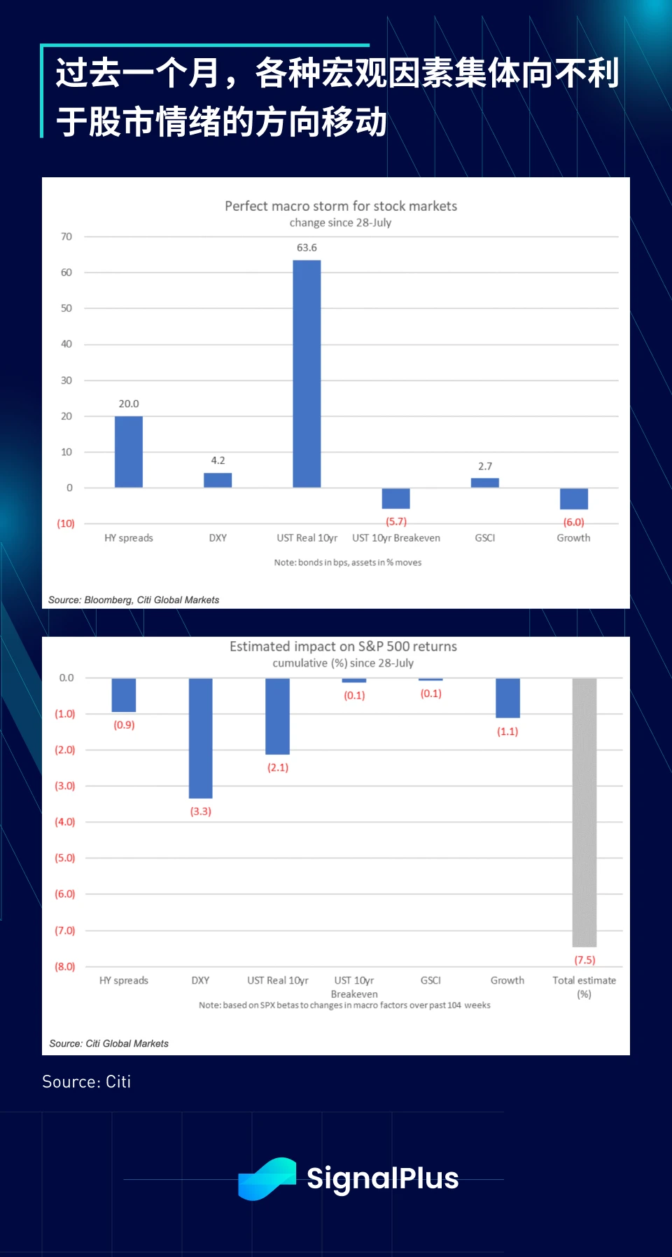 虽然其他资产类别普遍疲软,但关于原油库存下降的报告仍导致原油期货价格升破 94 美元,在 48 小时内大幅上涨了 7.3% ;在过去的一个月里,我们目睹了股市面临多重问题,包括实际收益率走高、美元走强、信用利差扩大以及增长预期下调,虽然利率上升无疑是其中最主要的因素,但对风险情绪而言,所有这些因素都集体往不利的方向发展,而市场单方面的(多头)情绪只会进一步加剧下行走势。