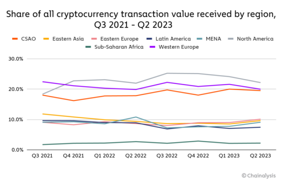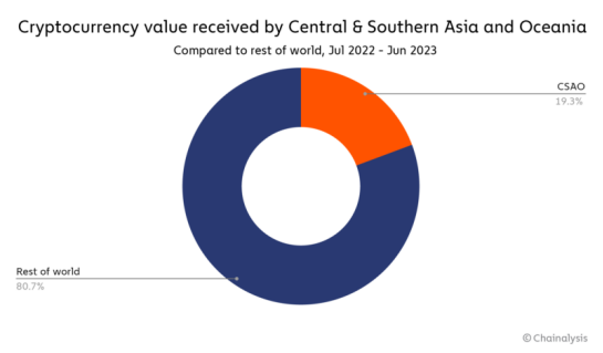 中亚、南亚和大洋洲(CSAO)拥有世界上最具活力和吸引力的加密货币市场。按原始交易量计算,中亚和大洋洲是我们研究的第三大加密货币市场,仅次于北美和中欧、北欧和西欧(CNWE),占全球交易量的 20%不到。