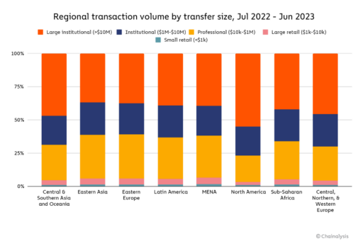 然而,原始交易量并不能说明全部问题。当我们考虑购买力和人口来衡量基层采用情况时,CSAO 占据主导地位。我们在全球加密货币采用指数中看到了这一点,排名前十的国家中有六个位于该地区:印度(1)、越南(3)、菲律宾(6)、印度尼西亚(7)、巴基斯坦(8)和泰国(10)。此外,去年 DeFi 在 CSAO 中发挥了更重要的作用,估计在 2022 年 7 月至 2023 年 6 月期间,DeFi 占该地区交易量的 55.8%,而上一年同期为 35.2%。该地区的机构采用率似乎也有所上升,总交易量的 68.8%来自价值 100万美元或以上的转账,而前一时期为 57.6%。