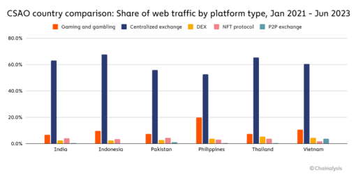 但重要的是,在采用加密货币方面,CSAO 并非铁板一块。在不同的 CSAO 国家,推动采用加密货币的因素各不相同,这导致不同类型加密货币服务的使用率也各不相同。我们可以从下图中看到这一点,该图显示了采用指数最高的 CSAO 国家不同类型加密货币平台的网络流量明细。