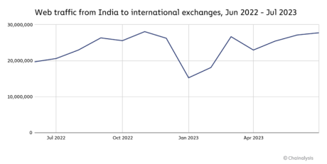 最近的报道进一步证实,该地区的业内人士向我们表示,TDS 的不均衡实施可能会增加印度本土交易所的竞争难度。虽然在印度运营的每家交易所都必须向印度用户征收 TDS 税,但许多国际交易所并没有有效地做到这一点,这可能会吸引印度用户而不是主要集中在印度的交易所。我们可以从下图中看到一些证据,该图显示,2022 年 7 月 TDS 实施后,从印度到国际交易所的网络流量立即激增。