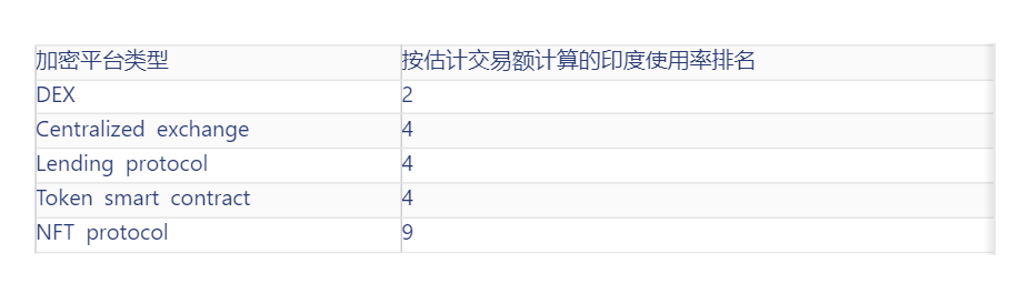 印度的加密货币使用跨越了几种不同的活动形式,在不同类别的加密货币服务中,印度的使用率排名前十。