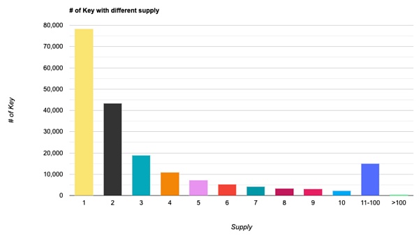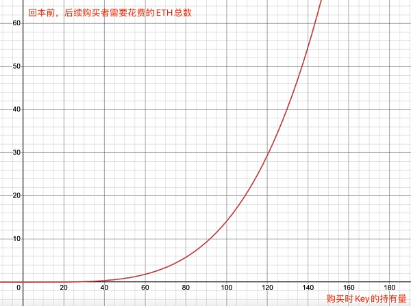 因此,实际交易中,购买的份数越靠后,回本所需的持有量越多。当 Key 持有量达到50时,持有量需要比购入时增加约10%才能让用户回本;在回本前,增量用户需要付出的总费用将成指数上升。若用户购入某 Key 的第 100 个份额,将需要等待后续用户购买11个Keys(后续总花费约为8 ETH),才能卖出回本;而如果是第200份Key,则需要后续购买者花费约68 ETH才能回本。