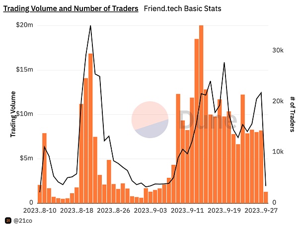 仅仅在推出的第一周,Friend.tech上的交易量就超过了7,000 ETH,显示出其强大的市场吸引力。至9月27日,已有超过27万名用户在平台上完成了792.7万笔交易。
