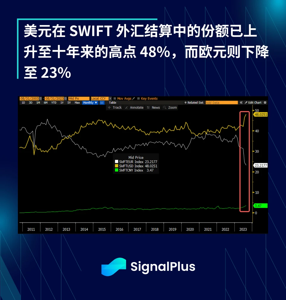 在外汇方面,尽管过去一年不断有人呼吁“去美元化”,但美元指数仍保持在年内高点,SWIFT 的一个有趣数据显示,使用美元作为结算货币的比例已经激增至十年高点 48% ,这一趋势实际上是“去欧元化”,欧元在结算中的份额从 45% 左右的高点下降到如今的 23% ,人民币的使用量则稳步上升,但仍处于极低的水平,仅为 3.5% ,当前情况驳斥了那些宣称美元即将崩盘的观点。